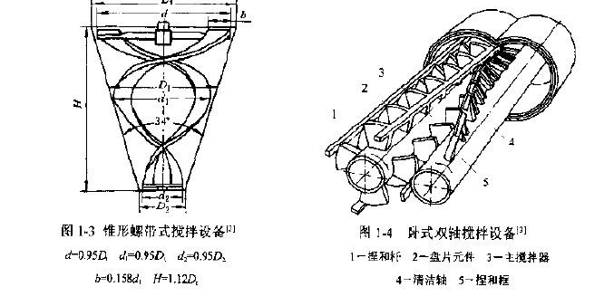 混合機的槽體的型式通常是立式圓筒形的,圓筒上部和下部都有蝶形或橢圓形的封頭,如圖1-1。也是一些混合機械是臥式的,像圖1-2.混合機的立式槽在常壓下操作時,為降低槽體的制造成本,混合機的槽上部也可是敞口的。磷肥工業(yè)、濕法冶金業(yè)和污水處理業(yè)用的數百或數千立方米的大型混合機攪拌槽,絕大多數是敞口的平底混合機攪拌槽。在攪拌含有較大顆粒的淤漿時,為了便于固體粒子的出料,常用錐形底的混合機攪拌槽。圖1-3中槽體是圓錐形的。使用螺帶式葉輪,它能混合高粘液體或粉體,與用立式圓筒形槽體的螺帶式攪拌機相比,它混合效率更高。 在臥式混合機攪拌槽中大多進行半斧操作,因此臥式斧與立式斧相比有更多氣夜接觸面積,故臥式常用于氣夜傳質過程,像氣夜吸收或從高粘液體中脫除少量易揮發(fā)物質;另一方面,臥式的料層較淺,有利于葉輪將粉末攪動,并可借混合機葉輪的高速回轉使粉體拋揚起來,使粉體在瞬間失重狀態(tài)下進行混合。 臥式混合機的攪拌設備有單軸的,也有雙軸的,像圖1-4.采用臥式雙軸攪拌設備的混合機目的是要使攪拌器獲得自清潔效果。當攪拌高粘液體時,若葉輪端部與槽壁有一定的間隙,則高粘液體會滯留與間隙中,這些滯留物的存在往往影響產品的質量。特別當混合機的攪拌設備作為反應器使用時,滯留物因反應時間過長或局部過熱而變質。為此,攪拌高粘液體的葉輪的外緣都與槽壁很接近,有時還在混合機的葉輪裝刮刀,即所謂刮壁式混合機攪拌設備。然而,即使采用了刮壁式混合機攪拌器,若采用單軸型混合機,高粘液體還可能粘滯在葉輪上,隨葉輪一起轉動,而若采用自清潔型的臥式雙軸混合機攪拌設備,通過兩支軸上特殊設計的混合機葉輪的齒合,使葉輪之間產生互相清潔作用,可使滯留物減至最少。